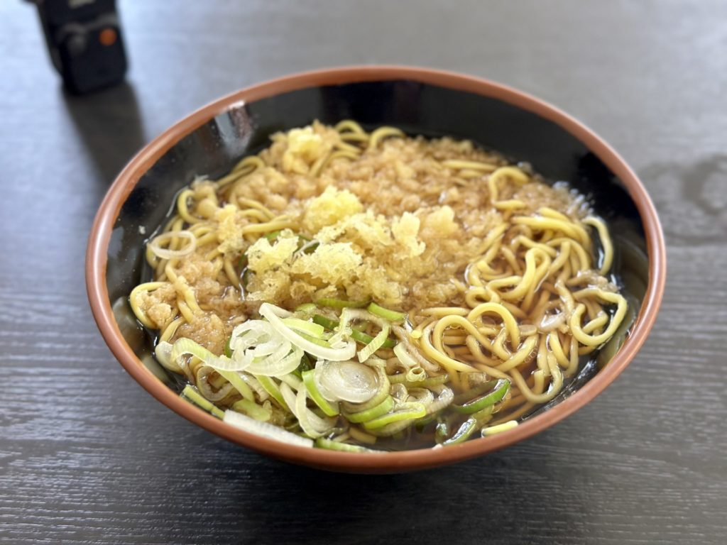 ぱっと見はたぬきそばだが、麺は中華麺。これがスタバなら「たぬきそば中華麺変更で」と注文するに違いない。