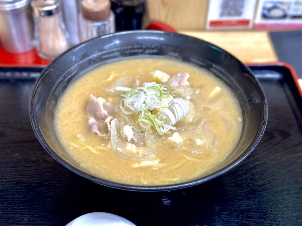 メニューはもちろんとん汁ラーメン。ひとことで表現すると、とん汁のラーメンだ。実際に食べてみると、ほんとうにとん汁のラーメンである。仮にゼロから名前をつけるならば、「とん汁ラーメン」しかないと思う。そのくらい、とん汁ラーメンなのだ。もちろん、スープをとん汁変更したわけではない。