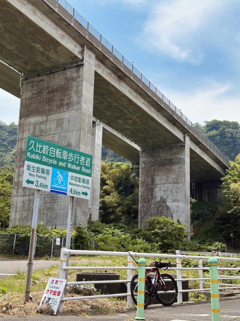この久比岐自転車道は、ずっと一本道が続いているわけではなく、ときには山の方に入ったり、ときには車道の右側に移動したり、なかなかに迷いがちなルートが設定されているのだ。