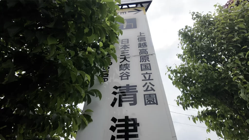 ついに清津峡の看板が見えてきた。うぉぉ!と雄叫びをあげそうになるも、声が出ない。