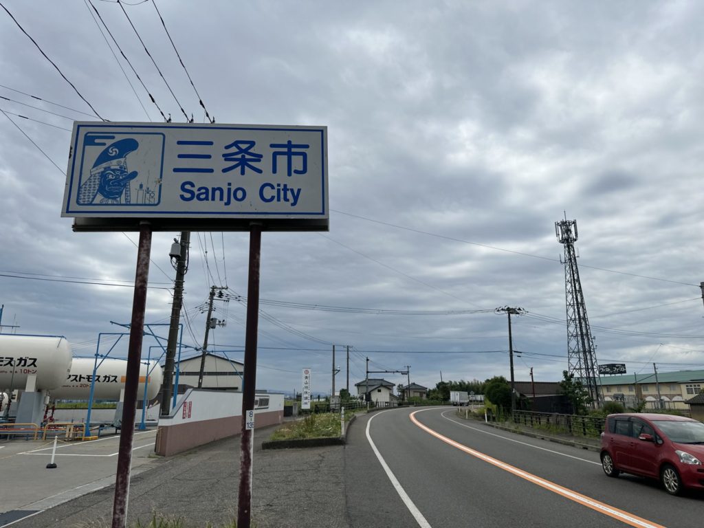 三条市の看板。車ではもう何十回、何百回と見てきたこの看板だが、初めて自転車で三条へ行き、この看板を目にしたときの感動は今でも忘れない。