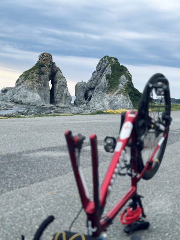 さて、夫婦岩が見えてきた。近くに寄ろうとしたその瞬間。スパーン!というキレのいいサウンドとともに、自転車がバランスを崩す。パンクしたと認識するのに時間は必要なかった。